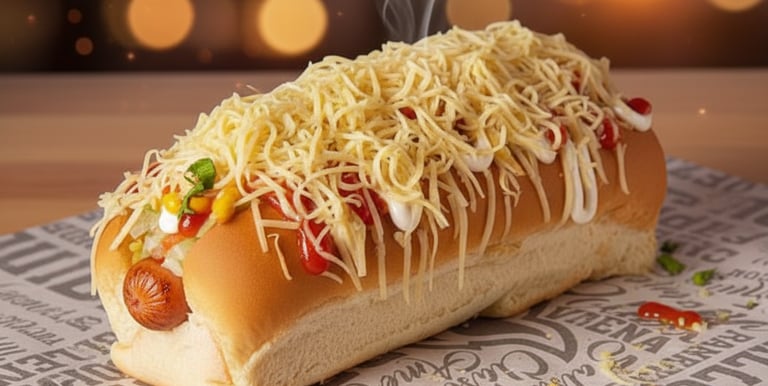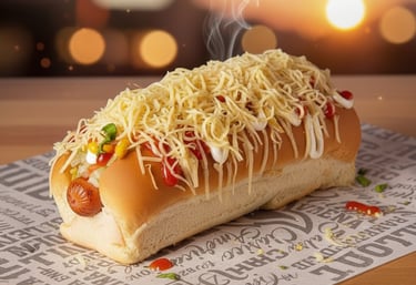 Enjoy our hot dogs topped with cheese and special sauces for a delightful treat.